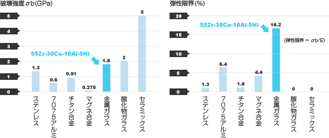 従来のアモルファス金属が非常に薄くて小さいものしかできないのに対し、金属ガラスは厚みのある形状の製品ができ、さらに成形や加工が容易なため、その応用範囲は大きく拡がりました。