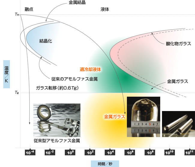 アモルファス金属は、溶けた金属を超急冷することが必要で、非常に薄くて小さいものしかできないといわれてきました。しかし、ゆっくり冷やしても結晶質にならず、アモルファスとなる金属が近年発見されました。ガラスのような特徴を持った金属ということで、金属ガラスと呼ばれていますが、ゆっくり冷やすこと ができるということで、厚みのある板や棒など形をもった塊状(バルク状)の製品ができます。さらに、従来のアモルファス金属では、加工や成形のため加熱を するとすぐに結晶質に戻ってしまい、アモルファスの特徴は失われてしまいますが、金属ガラスは、ガラスと同様自由に加工することができ(ガラス細工のよう に飴状に伸びる)、アモルファスの状態が失われません。現在、大学などで応用研究が盛んにおこなわれており、今後急速に実用化が進むものと期待されています。